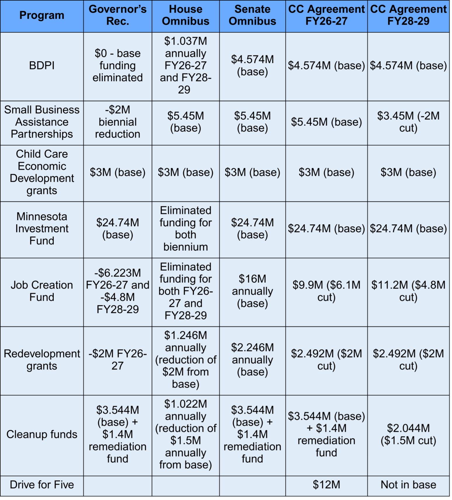 While preserving base funding for key programs may feel less exciting than new funding or programs, we fought hard and ultimately succeeded in pushing back against cuts to key programs given the committee target. I want to thank everyone who advocated against these cuts. Had the proposals from the Governor and the House been adopted, it would have seriously inhibited Greater Minnesota's economic growth and investments for years to come. Preserving funding programs like BDPI and MIF will ensure there are funds to support business expansion and the addition of good jobs for Minnesotans. Please feel free to reach out to the Jobs chairs Sen. Bobby Champion, Rep. Dave Baker, and Rep. Dave Pinto, as well as members of the Jobs conference committee, to thank them for adopting a budget agreement that will support a strong state economy.