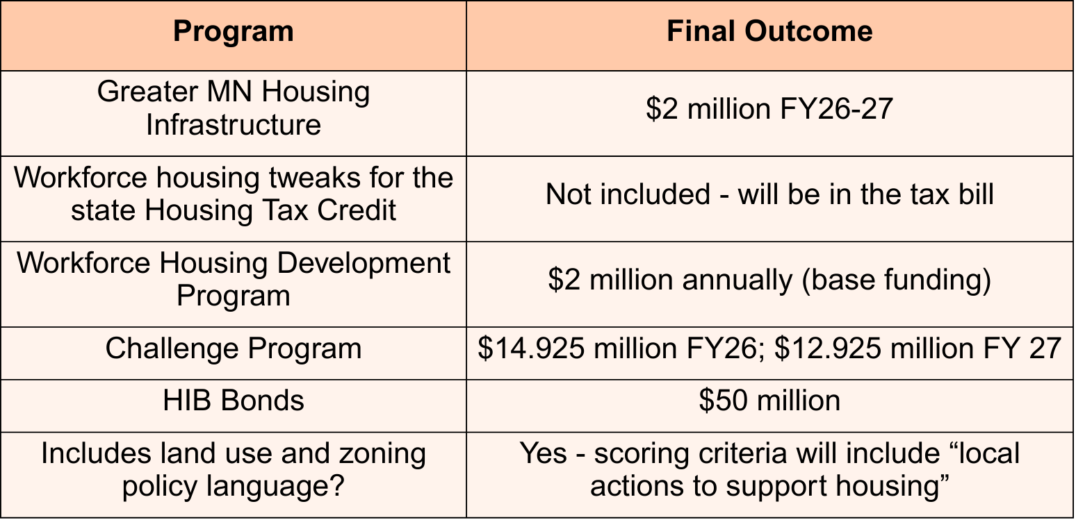 I want to extend another thank you to everyone who helped advocate for ongoing investments to support Greater Minnesota's housing needs. While the final bill included less money than we had hoped, there are still significant investments in key programs that will support an ongoing pipeline of projects. I encourage you to reach out to the Housing chairs (Rep. Spencer Igo, Rep. Mike Howard, and Sen. Lindsey Port) to thank them for their work to prioritize housing in Greater Minnesota.
